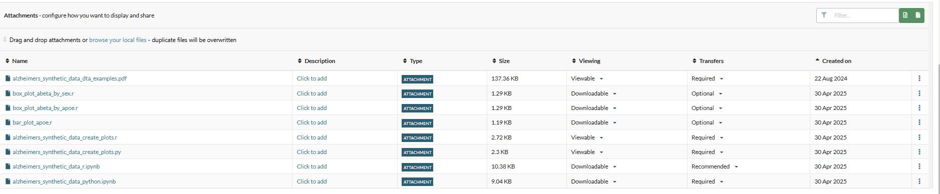 Data owners have always been able to add attachments to datasets, which can be downloaded by users directly to their desktop from FAIR, however, there is now significantly increased capability in this area. Data owners can now manage the visibility and transferability of each attachment. Allowing them to decide if attachments should be available for direct download, recommended for transfer as part of a DAR, or mandatorily transferred as part of a DAR. We will shortly be introducing folder support, allowing data owners to attach folders of files directly to a dataset, and researchers to request and transfer the full folder structure to a workspace.