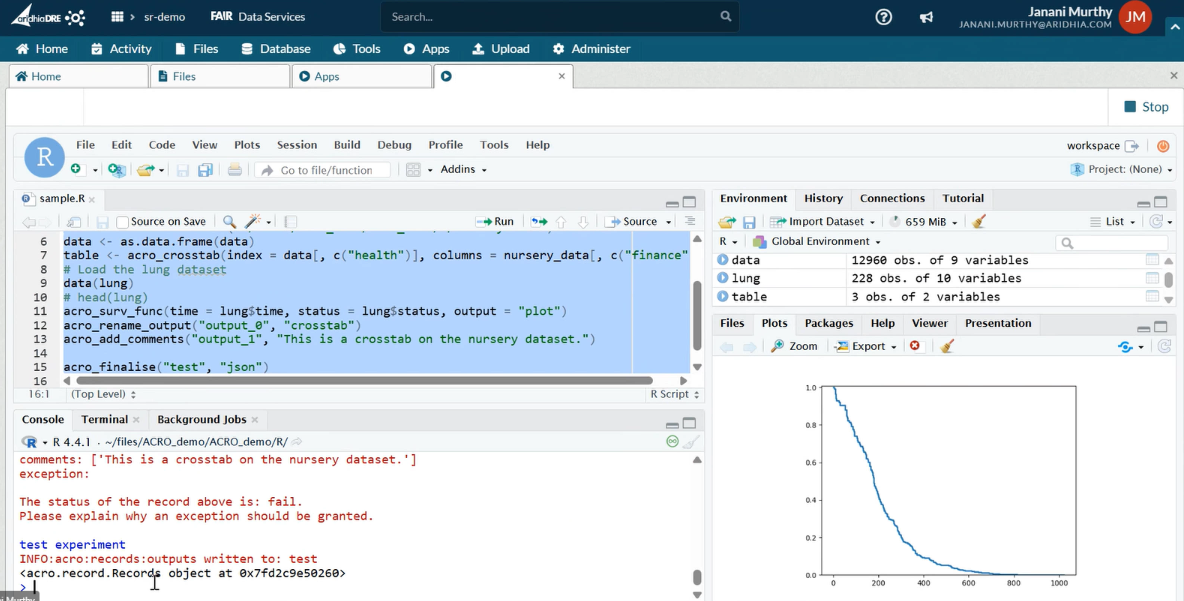 We began by running an R script that uses the ACRO library to analyse the SACRO-provided nursery dataset. This script executes securely within R Development Environment, which is fully integrated into the workspace.