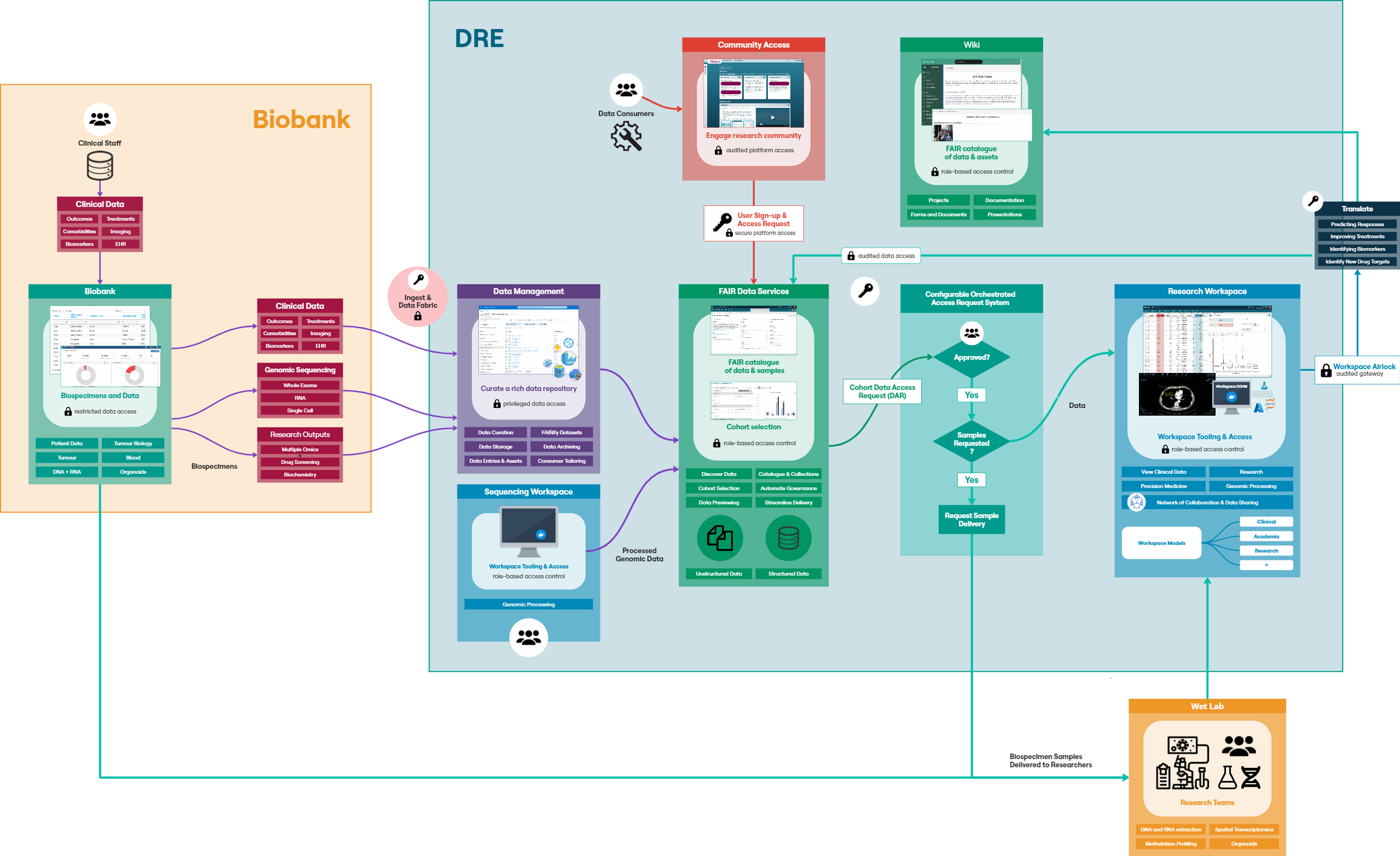 The DRE provides the facility to orchestrate and automate data access requests (DARs). Each DAR is fully configurable, allowing individuals who are not members of the DRE (such as data owners, or members of a review committee) to be involved in the Data Access Request process and approve or deny access. Users can track progress of their access request and are notified upon approval or rejection. Sample requests are reviewed by the LCC committee and if approved, processed through OpenSpecimen. These samples are then physically delivered to the requestor where analysis can take place, along with data analysis of corresponding clinical and research data. Information on the request, such as purpose is tracked in OpenSpecimen, associated with the requested samples and fed back into FAIR as part of the high-level patient data. This positive feedback loop allows researchers to build cohorts based on research that has previously been carried out and enriches the available data.When requesting data from the FAIR component, the user must have a valid and active workspace. Upon approval of a dataset that includes clinical or genomic data, the data is made accessible from within a workspace. The workspace is a secure, collaborative, web-based research area, providing dedicated out of the box and LCC-specific tooling to facilitate detailed statistical analysis of clinical data and omics data.