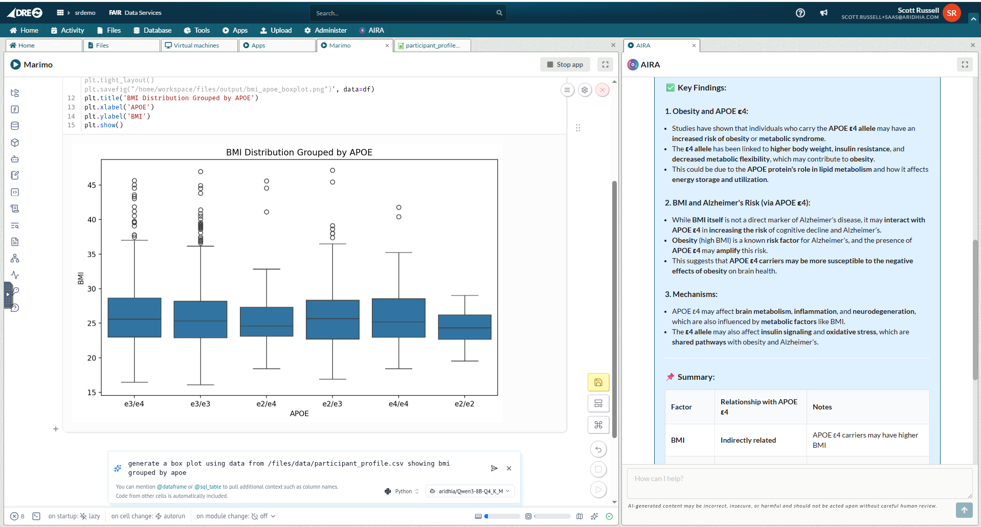 AI has real potential to accelerate healthcare research, but that potential shouldn’t come at the cost of the security principles that make TREs trustworthy. The combination of the Aridhia DRE Workspaces for secure data collaboration and AIRA for responsible AI use provides researchers with a secure framework for AI assistance while keeping control with the data owners and administrators. External API access can then be made available where it makes sense, but as a governed and traceable choice.